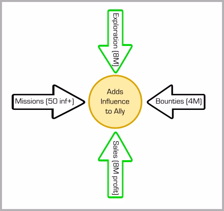 Nehmen wir an, ein Verbündeter hat 30% Einfluss in einem System mit einer Bevölkerung von 1 Million. Wähle die “1M” Zeile auf der linken Seite und die “30” Spalte oben. Die Tabelle sagt uns, dass du an einem perfekten Tag mit 39,7% Einfluss enden könntest, ein Gewinn von 9,7.