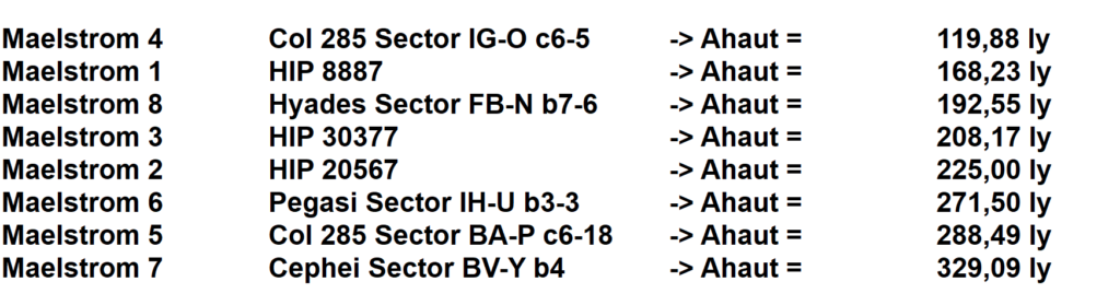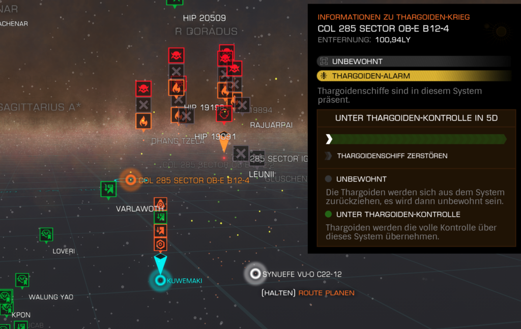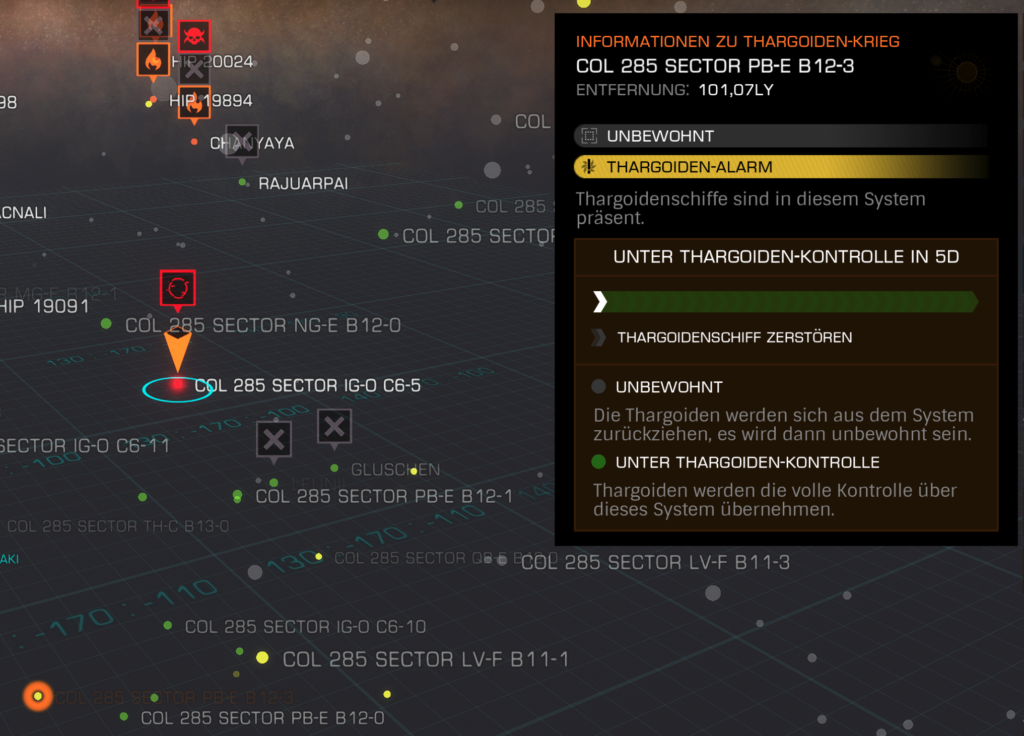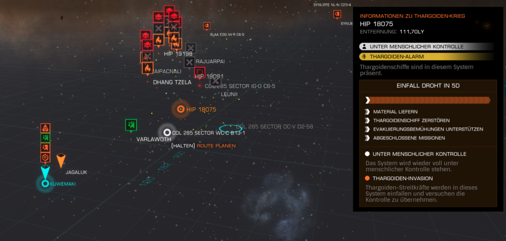 Auch wenn Mahlstrom 4 ca. 116 Lj entfernt scheint, habe ich ca. 8 Systeme (gelb markiert in der Sternenkarte) ausgemacht, die Thargoiden-Alarm haben, ein bis zwei sind näher dann an uns und solange nichts in dieser Richtung getan wird, expandieren die weiter.