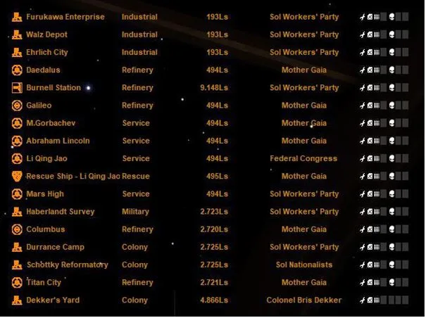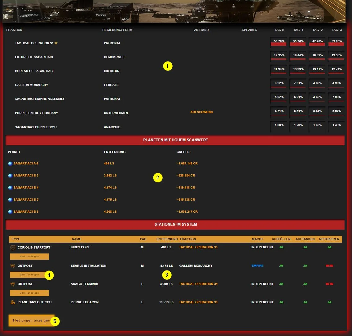 Liste der Stationen im System: Art, Name, Wirtschaft, Entfernung, Stationsinhaber, wichtigste Dienste (Aktualität hängt von der letzten Landung eines CMDR inkl. Übertragung an EDDN ab)